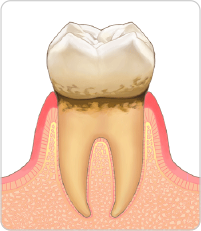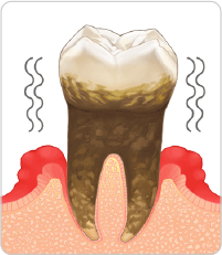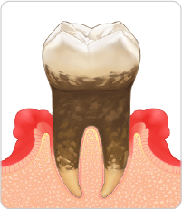 歯周ポケットは6mm以上になり、歯肉・歯槽骨の減退によって歯の根も見えてしまいます。